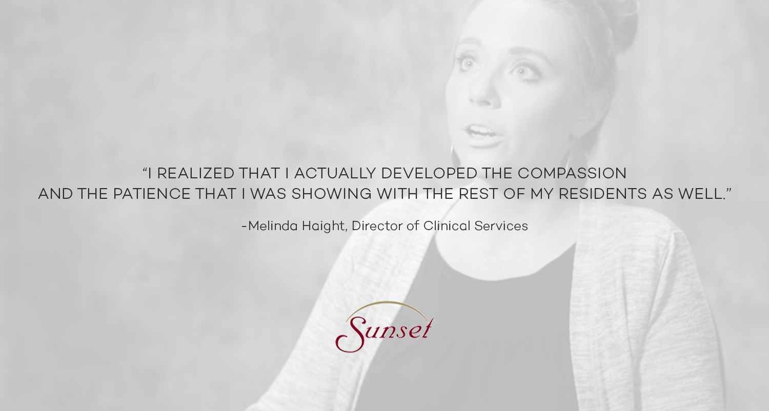 One night, Melinda Haight, Director of Clinical Services, offered to care for a resident named Ruby who had moderate Alzheimer’s. Ruby had become nonverbal and was known to be a bit more challenging to care for. However, over time, Melinda and Ruby began to form a strong bond.