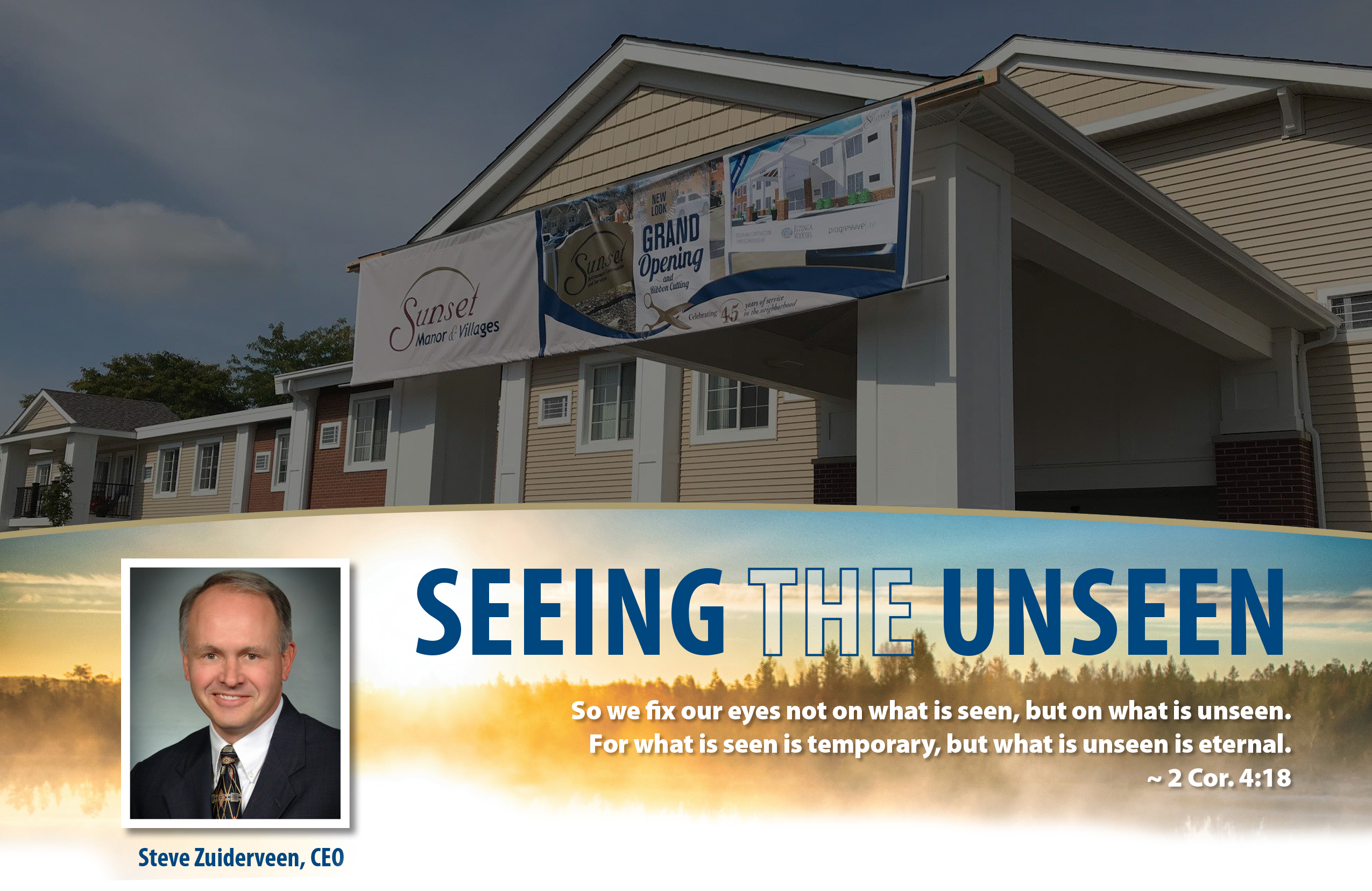 Forty-five years ago a group of caring people came together to create a vision for what it would look like to be the hands and feet of Christ to the elderly. I can’t help but think that there were times that the future looked very foggy and uncertain, but they focused on what was unseen. I am very grateful for the wonderful blessing we all enjoy from Sunset because of the faithfulness of God’s people.